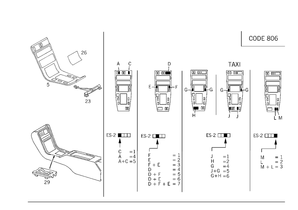 - Notes: =============================================================================================================================i zum bestimmen der varianten-nr. (es-2) sind in untenstehender tabelle der serien - es 2 und der es 2 fuer sonderausfuehrung zu addieren 140.028/032/033/042/043/050/051/135 mit code 808 linkslenker serien - schalteroeffnungen warnblinker,spiegelversteller,fensterheber 4-fach,panikschalter,fondkopfstuetzen,asr/esp,heckdeckel-fernentriegelung serien - es 2 = 0000 special versions code 882 = es-2 4000 - edw-as-irs code 938 = es-2 1000 - hands-free system code 228 = es-2 0400 - auxiliary heater code 214 = es-2 0100 - ads code 873 = es-2 0040 - seat heating code 245 = es-2 0020 - on board computer code 450 = es-2 0010 - taxi code 220 = es-2 0004 - parktronic code 540 = es-2 0001 - roller blind =============================================================================================================================i.